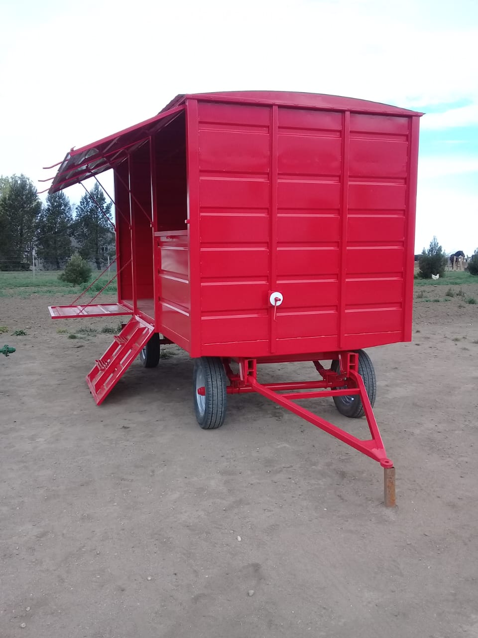 Para transportar herramientas y equipos al campo. Cuenta con una puerta lateral que se abre hacia arriba, formando un toldo, y escaleras desplegables para facilitar el acceso. Está equipado con ruedas y un enganche para ser remolcado por un vehículo o tractor.